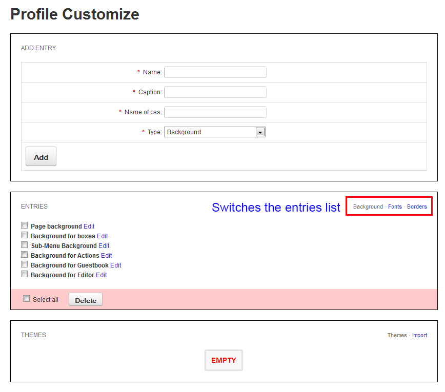 It is easy to add them. For example, to add Box Backgrounds to the Profile Customiser, you just go to the add new form and enter the following into the correct fields: