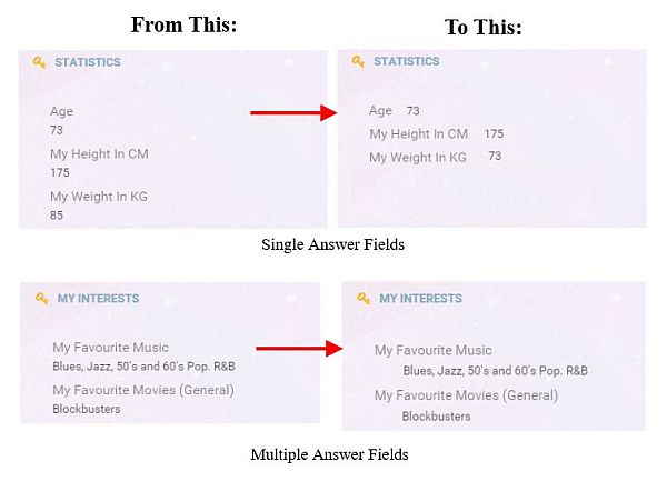 I have a lot of profile questions and Profile View looks a bit untidy. I'd like to make the following changes and I'm hoping some kind person can help me pin-point the code I need to change: