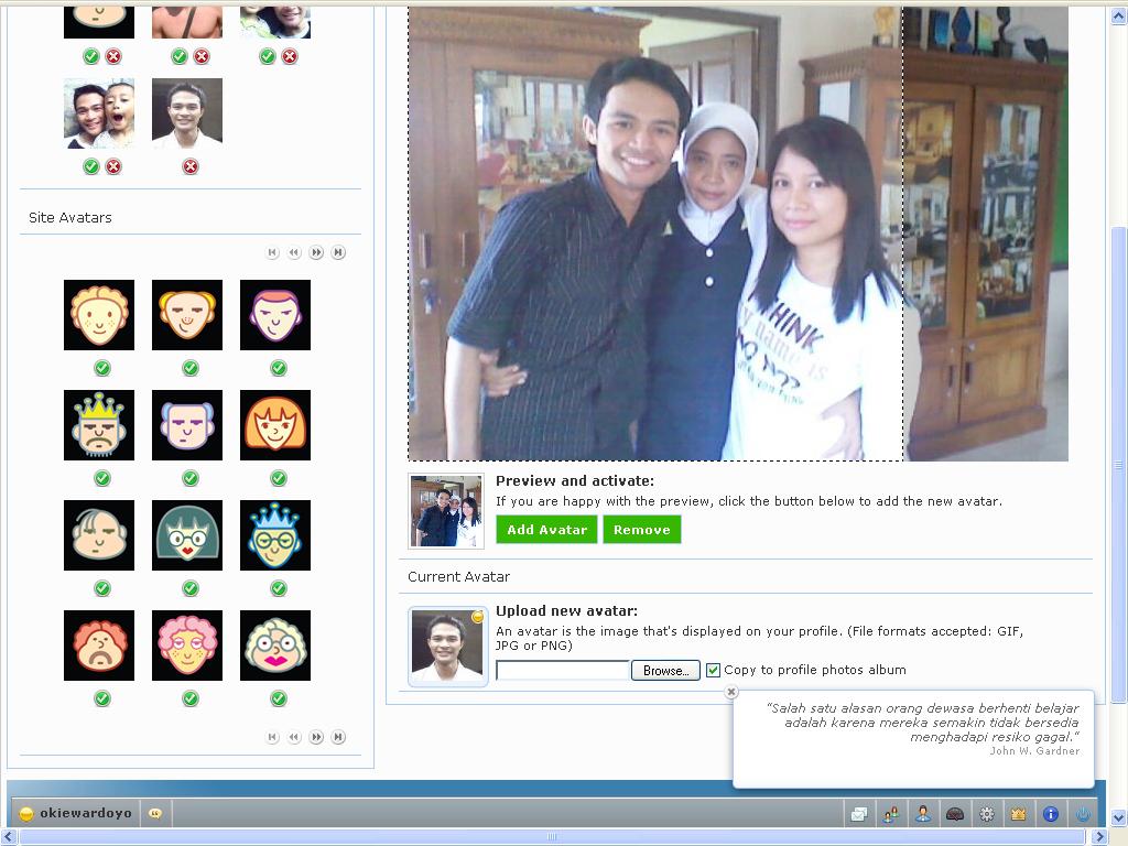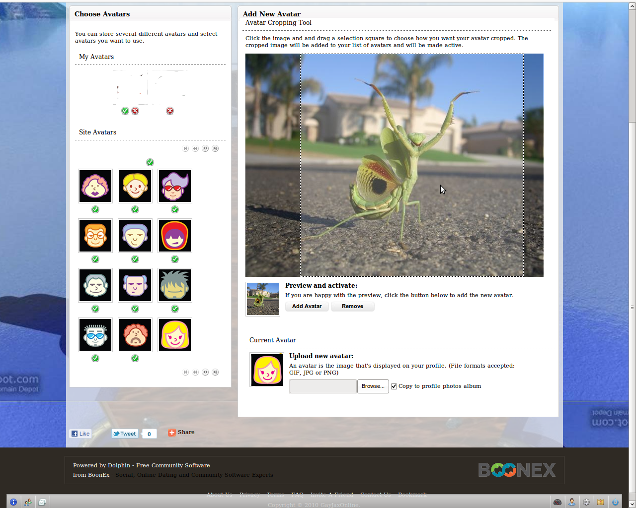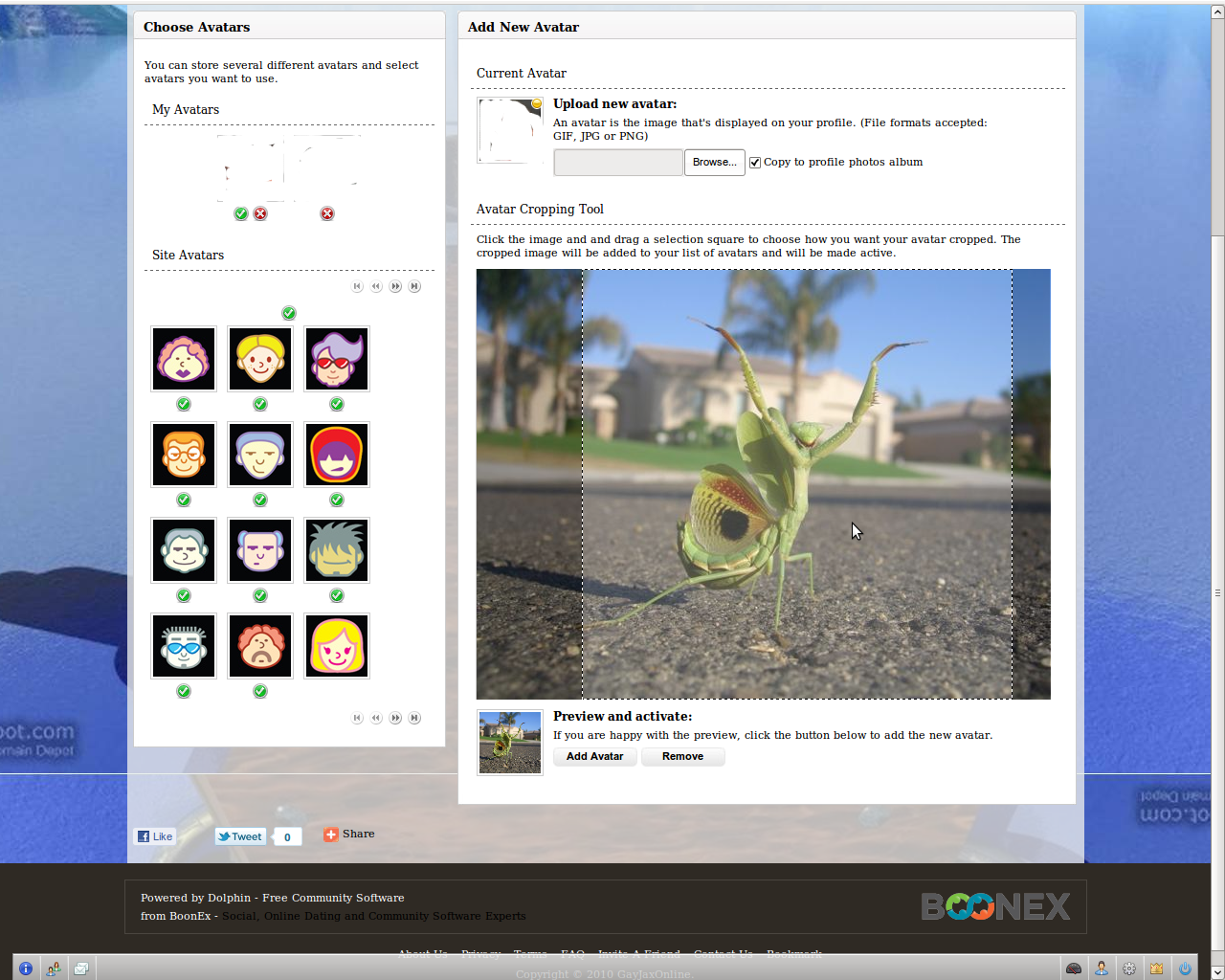 Open yoursite.com/modules/boonex/avatar/templates/base/block_wide.html JUST CHANGE THE POSITION, like my attached file below ^_^ Your the BOMB! You get much deserved "like" from me. This was a much needed adjustment to sites, users do not see the bottom and never complete the avatar selection. User's are uploading avatars but don't scroll down the page to see the rest... iIT'S COMPLETELY NEEDED => http://friends.smansakra.sch.id => friends community based dolphin 7 |