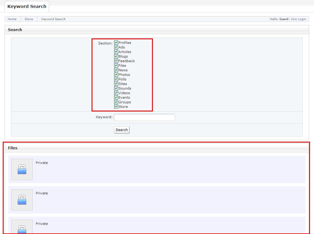 Not really a bug, but definitely poor usability, as objects (e.g., files) which are private and not accessible by a user are displayed in keyword search results (see attached image).