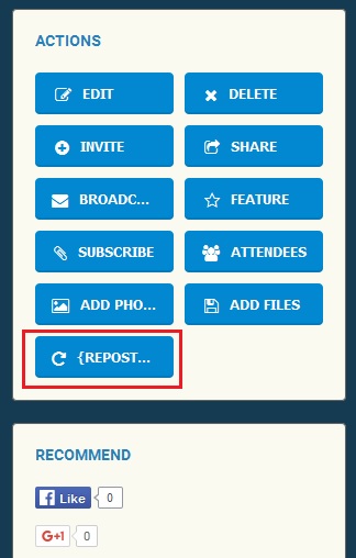 Repost button is displayed (in this case on a created Event), despite the Timeline module being disabled.
