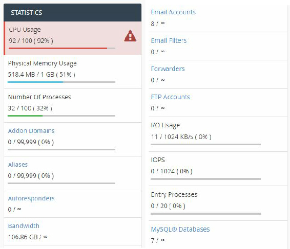 Your site has been limited within the past 24 hours CPU resources were limited for your site You have reached entry processes (number of simultaneously running PHP and CGI scripts, as well as cron jobs and shell sessions) limit 428 times Your site might hit resource limits soon You had 1024 I/O usage out of 1024 max I/O usage allowed You had 50 I/O operations per second out of 50 max I/O operations per second allowed Due to the statistics, we are receiving this will be an indicator of a site which needs to be optimized by an experienced developer who can take care of the running PHP, CGI scripts. Please note that this requires development assistance, which is something we do not provide, yet. You may contact some expert local developer to assist you further. |