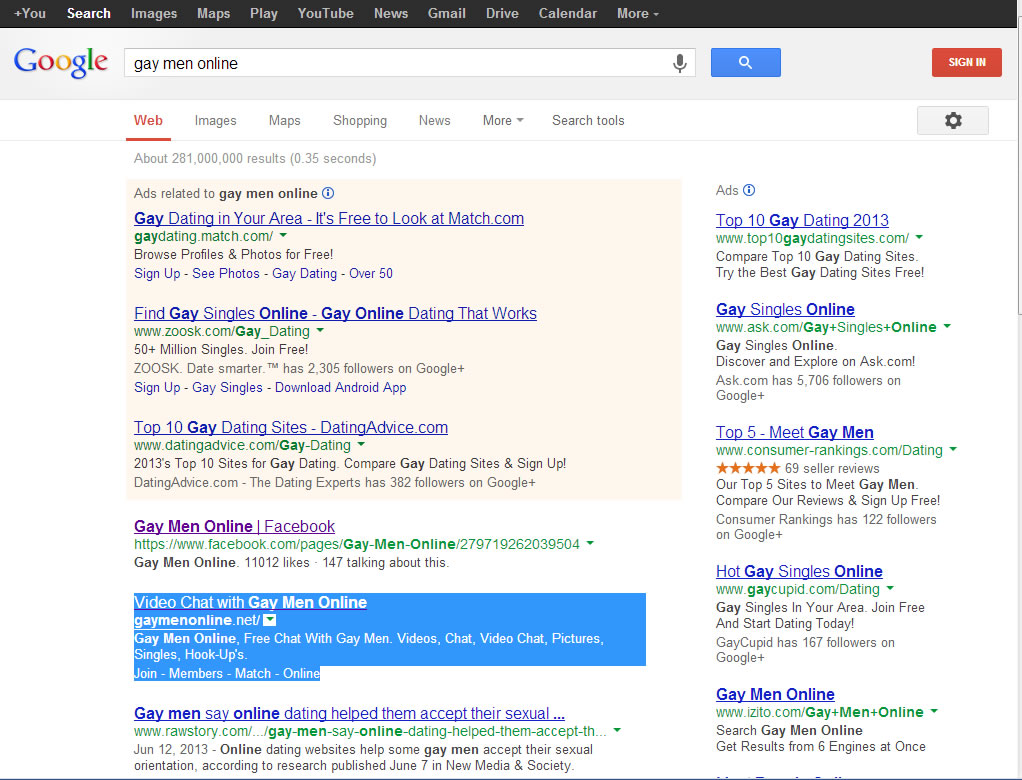 I decided to test a search query of Newton's site. I searched on "gay men chat" without the quotes. Gaymenonline.net showed up on the first page of the search results. It was at the bottom of the page but it was on the first page. Landing on the first page of a search query is important. Studies have shown that users won't go too many pages deep in a search result; most, if I recall, won't go beyond three pages deep.