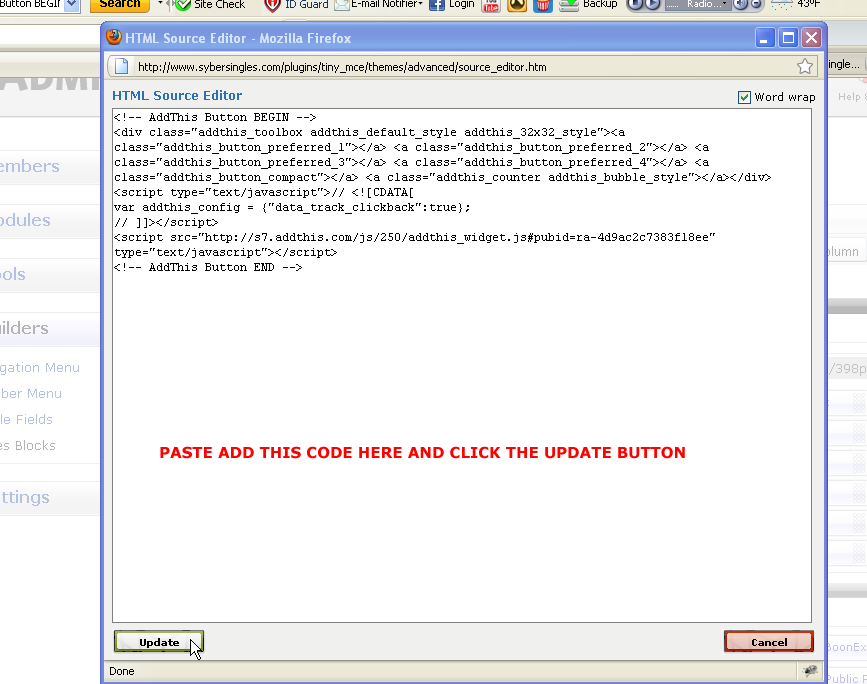 I tried this but didn't work, The only way it will work for me is if I put the code in admin>tools>banner. Once I remove the code from the banner it also disappears from the html block even though its two different cose i'm using. Hi, I found the simplest way to get AddThis buttons to work in boonex is to do the following: