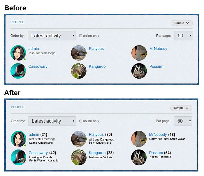 Yes Please! This is yet another oversight by the designers of Dolphin. Adding this information during programming would have been a few additional minutes work, but a world of difference to the end user. The current results show the member's name and the status message if used. As most people don't update their status message or often make a meaningless statement, the search results are nothing more that a screen full of thumbnails and member's names that may mean nothing. Please see my before and after shots. My site is localised, but Country will also help on international sites. Can someone please help with this? I believe it's something almost every Dolphin user would want.