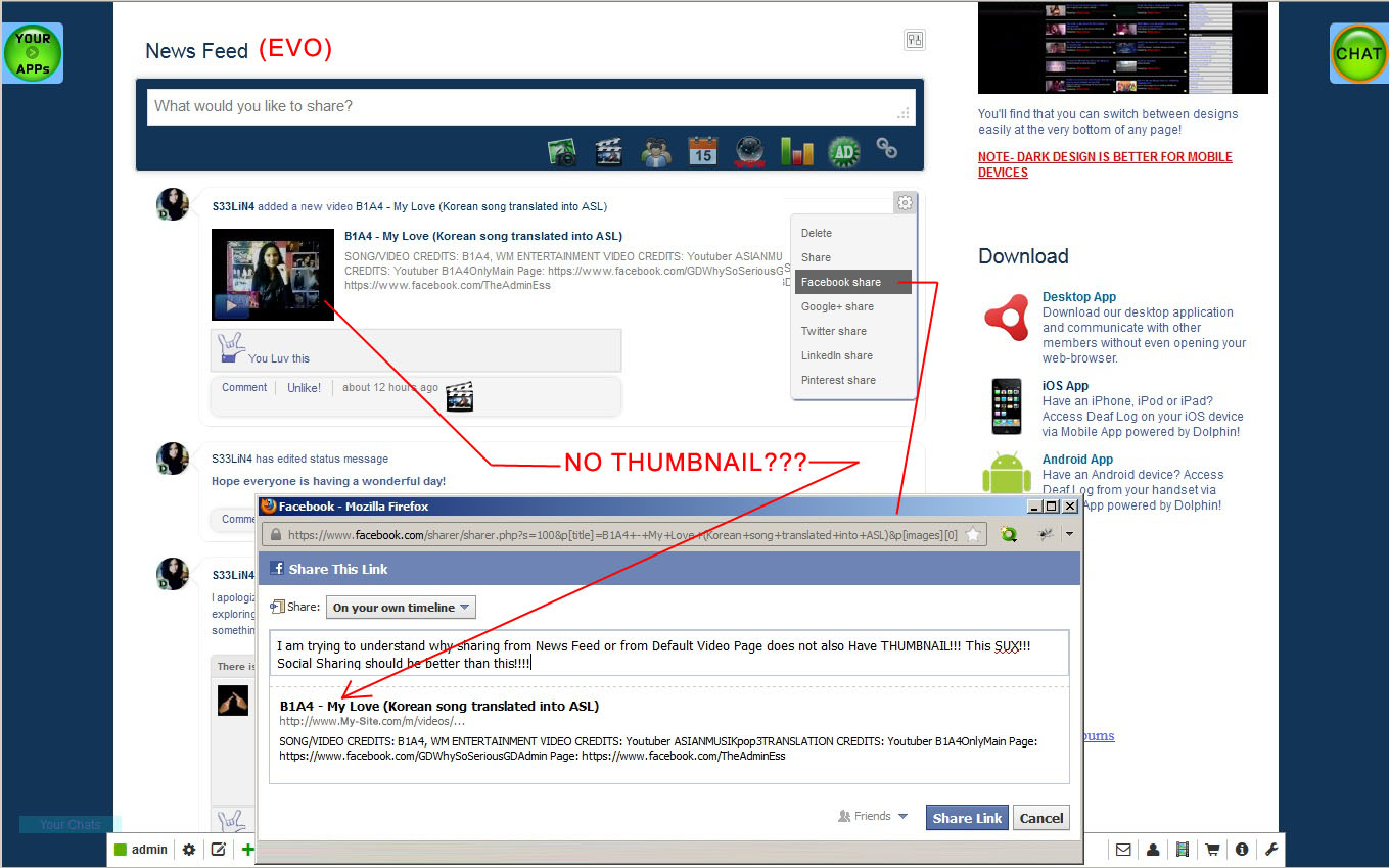 Here's my main complaint- No matter what we share, there should always at the least be a thumbnail that appears at the site we share "something" to. This is hit and miss really with regard to the default sharing options I have with my Dolphin site.