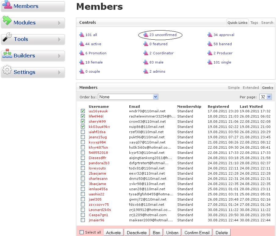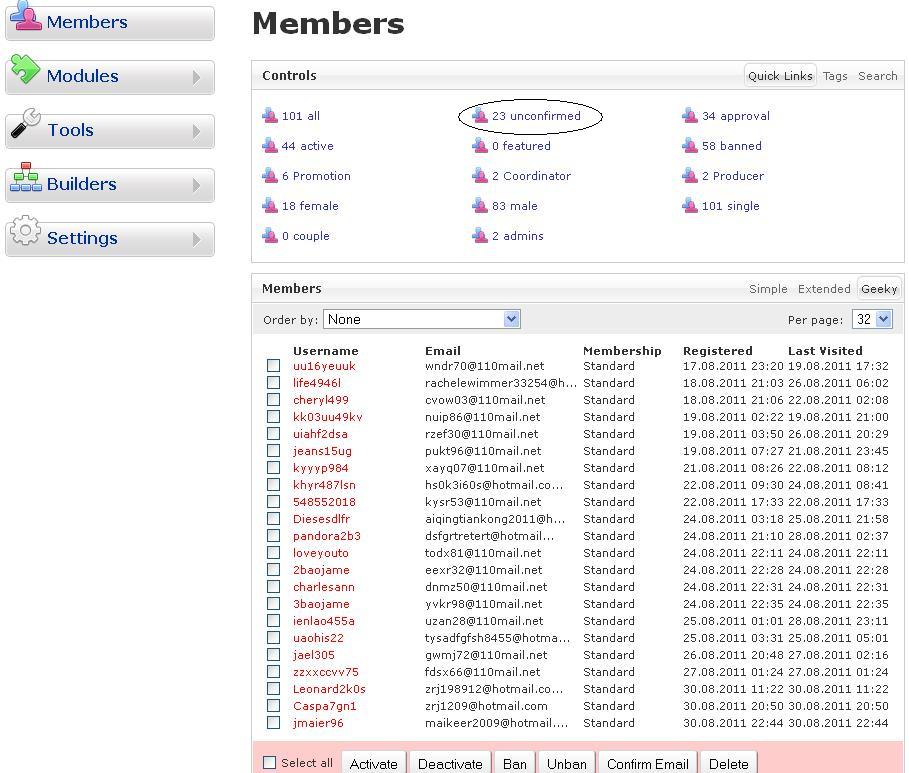 All, unconfirmed , approval or active or etc. Let’s say we choose to enter the unconfirmed potential members or the approval potential members. We screen the members and we choose who is a person with an interest on us and who is a spammer. Therefore we authorize the firsts and we ban the others. When ever we ban a spammer his/hers address becomes red then we tick the box on our left side of our screen. Then we choose to delete them but when we choose this option see what happens:
