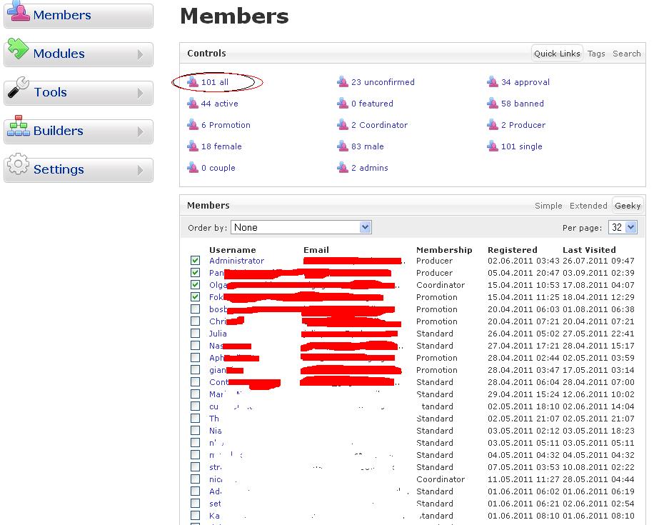 Example if we choose to delete one spammer as a result one member will be chosen to be deleted from our members section. If we choose to delete 4 spammers then as a result four members of our members will be ticked to be deleted as well. So what we do is we “un-choose” the ticked box or boxes that has been automatically chosen. And we start all over again in order to delete other spammers. The funny thing among the others is that we can delete only one spammer at the time. What is also difficult, is that if we do not “un-choose” the ticked box at the all members section when we go to delete more spammers we also delete automatically our members. It happened before and we had to create new accounts for administrators and members and this is a waste of time.