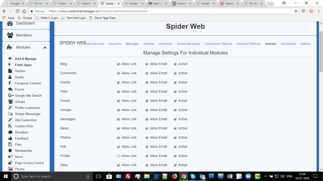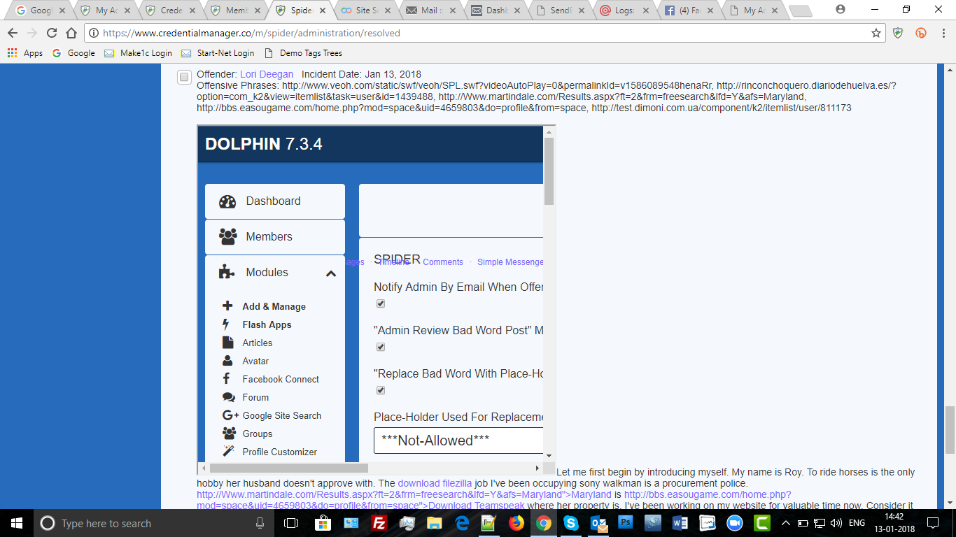 I have a question about the MODULES link in the Spider Web Admin. Is this the area to use for allowing and not allowing Links & Emails in the respective Modules listed? I have attached a printscreen and you will notice in profile I have un-checked allow links. Does that mean no links will be allowed to be put there? As you know HTML doesnt work in the Profile description so I am wondering if I have interpreted this correctly. I am getting a few members putting in html anyway and posting porn sites. If this will prevent links from being added to the description that would be great. I am also adding the links as I discover them to keywords just using the domain (eg, porn.com). How does it interpret links? Will it see http://porn.com and www.porn.com (No http) as links? Thank you for the module.