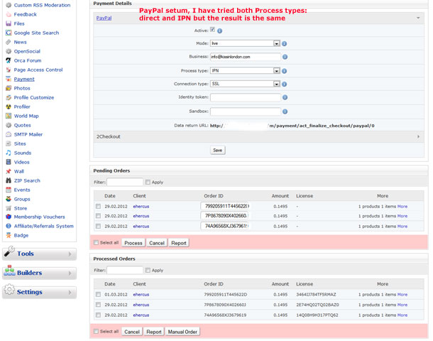 We have 7.0.9, we set up paypal and all was well for a few days. Payments were processing and memberships were updating fine. Then the trouble started, random purchases were not posting back to our site, memberships were not upgraded, and no email confirming payment was recieved. These were not on consecutive transactions, seemed to be intermittent. Today, no transactions will go through properly. Paypal shows the ipn is sucessfully sent which means they are recieving a response from our server confirming receipt of that but that's as far as it goes. We do have 3 showing in pending orders, but there is no order id associated with them. We didn't install any new modules or 3rd party software when this started. We did install Chat Summary Yesterday, but that was after this trouble started with paypal.