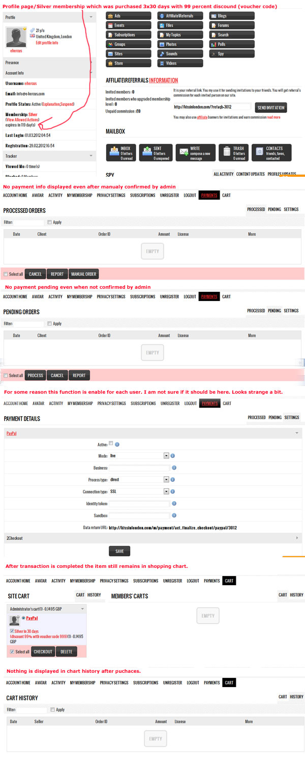 Another thing is chart, when I go to my shopping chart I can still see the membership level ready for purchase even after the purchase is completed. Also there is no information of purchase history or payments. And it doesn't display any info about processed or pending payments. And another strange thing is that user has an option for settings same as in admin panel for PayPal and 2Checkout, this is very strange. I do not think there is a need for every user to have this option available unless I am not aware of other reasons.