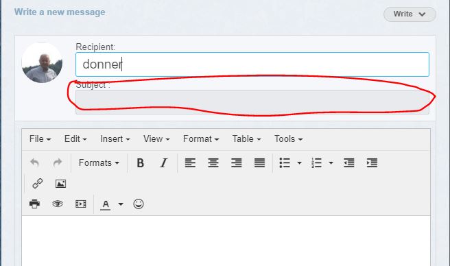 ändere einfach das Feld in etwas wie: <input type = "hidden" value = "" id = "compose_subject" class = "form_input_text" value = "your ling default subject" /> I searched my Dolphin 7.4.2 with agent Ransack mail_box_compose_message.html not found Unfortunately, this file does not exist I had the code changed with success. Subject was no longer visible Unfortunately, no messenger email can be sent because Dolphin misses typing in subject. Error message from Dolphin: "Please enter the title" |