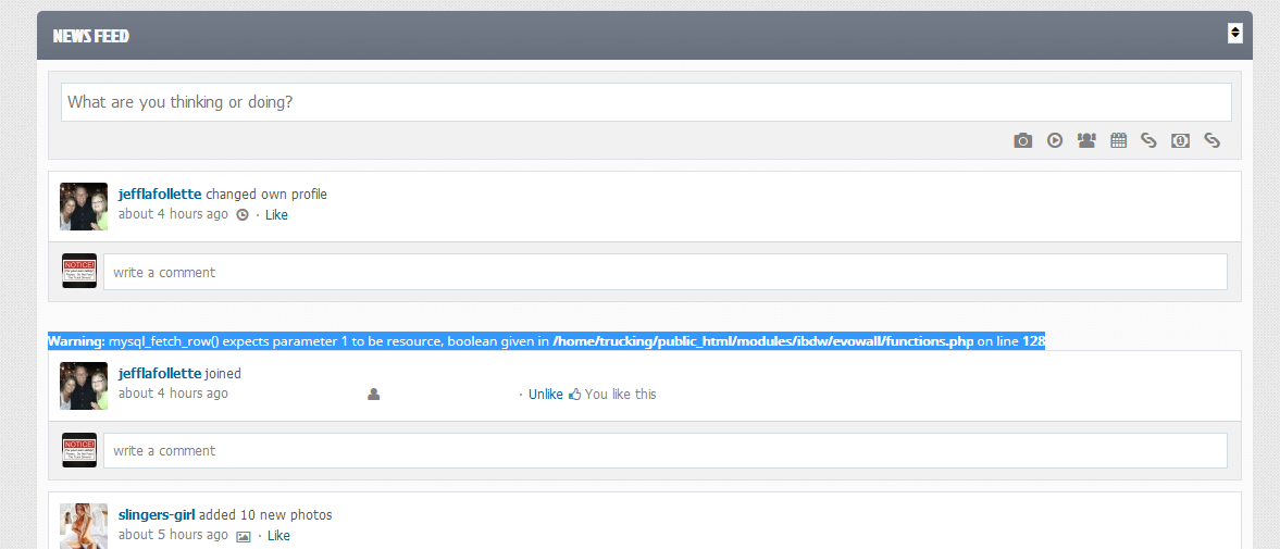 Warning: mysql_fetch_row() expects parameter 1 to be resource, boolean given in /home/trucking/public_html/modules/ibdw/evowall/functions.php on line 128 It seems a privacy setting issue. Contact us in order to investigate better directly in your site. See my products at http://www.boonex.com/market/posts/ilbellodelweb | Hosting: zarconia.net |