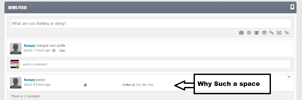 Ok I have a new problem. If you like a post. There is a large space. Also if I use my phone to comment someones post. There is no way of doing it? My phone does not have a submit button or and enter button on it. So there is no way I can reply to a post on the wall from my phone. The problem is related to something introduced by the custom template. We can't reproduce the same issue on a standard D7.1 with a default template. So we have to check your site. See my products at http://www.boonex.com/market/posts/ilbellodelweb | Hosting: zarconia.net |
