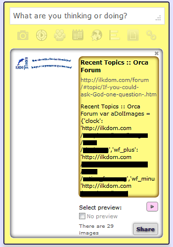 This happens when trying to share in-site forum link (attachment). By the way, my old complaint about photos not being inserted into Photos section, when uploaded via EVO wall, is no longer valid, it was my own oversight. :) |