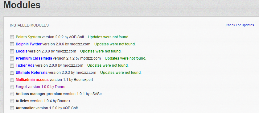 Feature Request for Multi Admin > Access Please add a "Select All" feature that will 'check' all the check-boxes at once. I'm finding that it would be *much* easier for me to have them all checked then uncheck those that I wish to block access to. Especially considering the large number of add-on modules I have installed. Thank you :-) http://pkforum.dolphinhelp.com | |