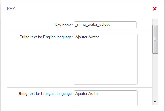See the screenshots. When I translate Avatar upload in the key "_mma_avatar_upload (BoonEx Avatars)" the modifification not displayed and is in English even if I change language. It is the same for all keys in the table. il manque aussi la clé _MEMBERSHIP