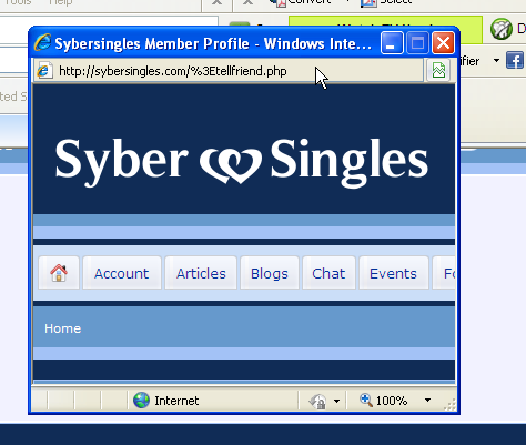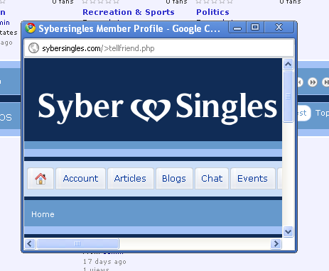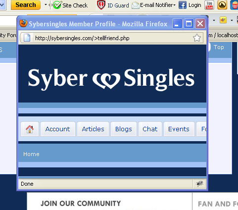 I didn't see any error there. Provide us with some explanation screen shots please SASHAE - How can you not see the error?? if you go to www.sybersingles.com and go to the bottom of the page and click on the footer link for invite a friend the window pops up with the error. Its not hard to see or find if you go to the site. |