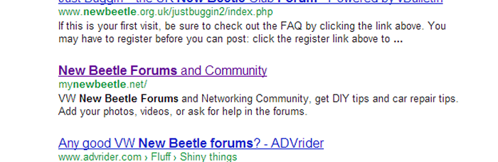 Also; have you filled in the information here /administration/advanced_settings.php click on "General" in the list, drop down shows place for meta info.. Homepage meta-description: VW New Beetle Forums and Networking Community, get DIY tips and car repair tips. Add your photos, videos, or ask for help in the forums. ManOfTeal.COM a Proud UNA site, six years running strong! | ||||||||