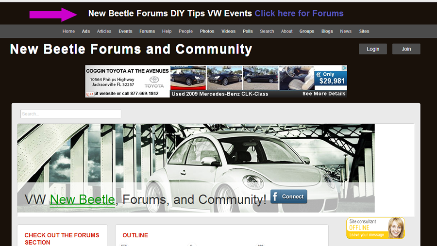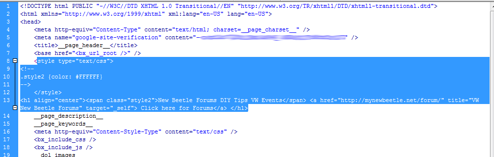 I just found this.. and have had some PM's about how to do this in a bit more detail so here it is. If your using the default template, open the folder /templates/base/_header.html your going to add a couple lines. Please tailor to your needs of course. style type="text/css"><!--.style2 {color: #FFFFFF}--> </style><h1 align="center"><span class="style2">New Beetle Forums DIY Tips VW Events</span> <a href="http://mynewbeetle.net/forum/" title="VW New Beetle Forums" target="_self"> Click here for Forums</a> </h1> The "style" is to make the text white for my black background, change to what you want. ManOfTeal.COM a Proud UNA site, six years running strong! | ||||||||