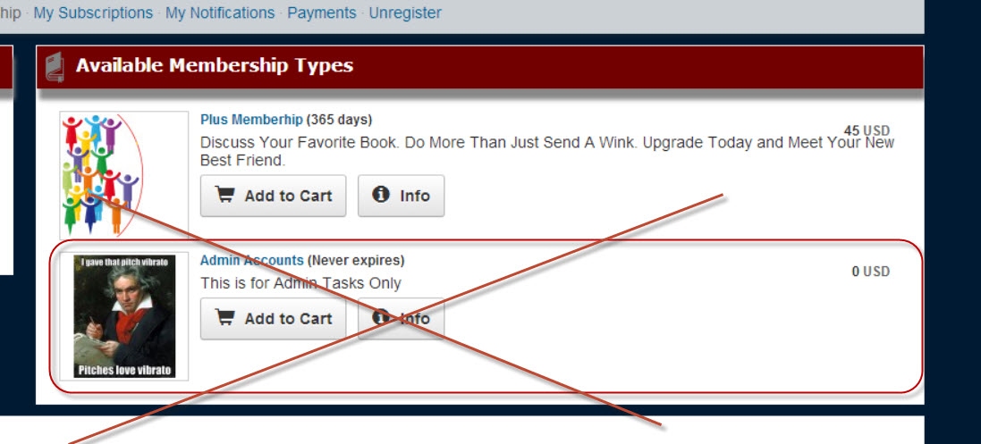 if you disable the membership level after changing the admin account to that membership level, it will stop it from being displayed. Not sure if it will affect the actual account with that membership level. Another idea is to go into the database - sys_acl_levels - and make that membership level unpurchaseable. caredesign.net |