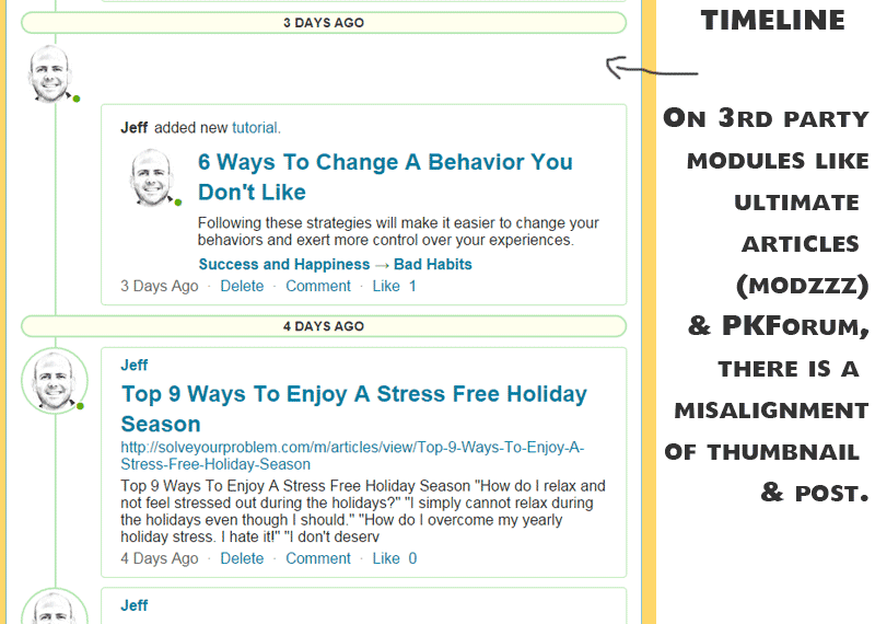 However, when a post using a 3rd party module appears in the timeline, the thumbnail & post are misaligned (image below). Happens with Ultimate Articles, PKForum & all the mods I have.