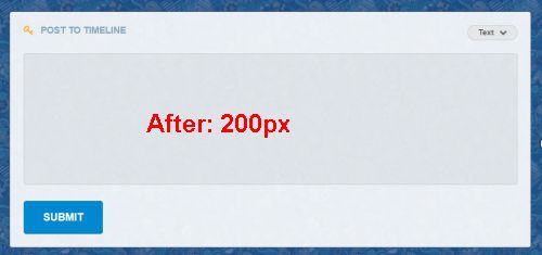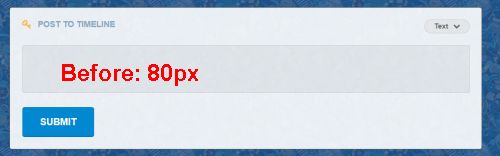 div.wall-ptype-cnt div.WallPostText_wrapper textarea.form_input_textarea { height: 100px; } Need I say it, backup first, use a non-destructive editor (Notepad, Notepad++) and clear the cache. |