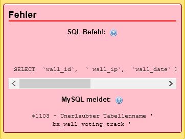 SQL-Befehl: SELECT `wall_id`,` wall_ip`, `wall_date` FROM` bx_wall_voting_track` # 1103 - Illegaler Tebell-Name bx_wall_voting_track |