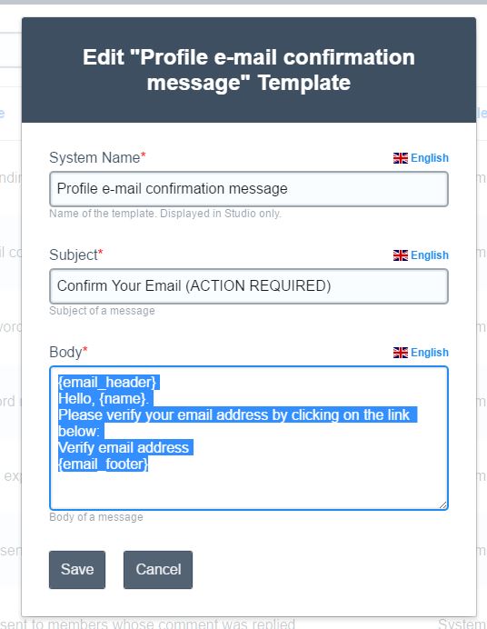 For now I would suggest to edit email templates using language keys editor: Studio > Polyglot > Keys Rules → http://www.boonex.com/terms |