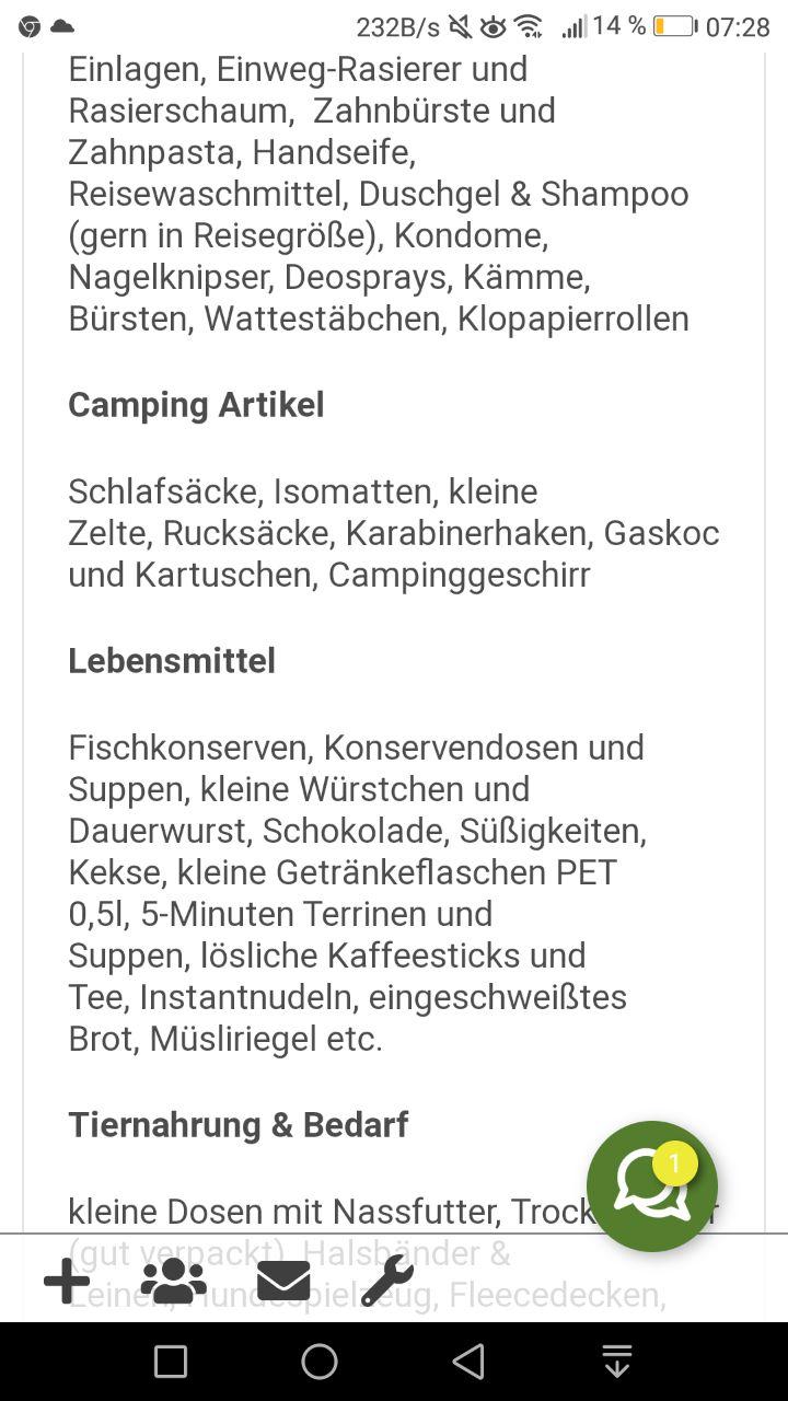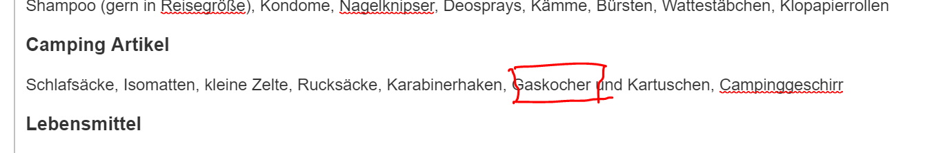 1. The sentence is Schlafsäcke, Isomatten, kleine Zelte, Rucksäcke, Karabinerhaken, Gaskocher und Kartuschen, Campinggeschirr