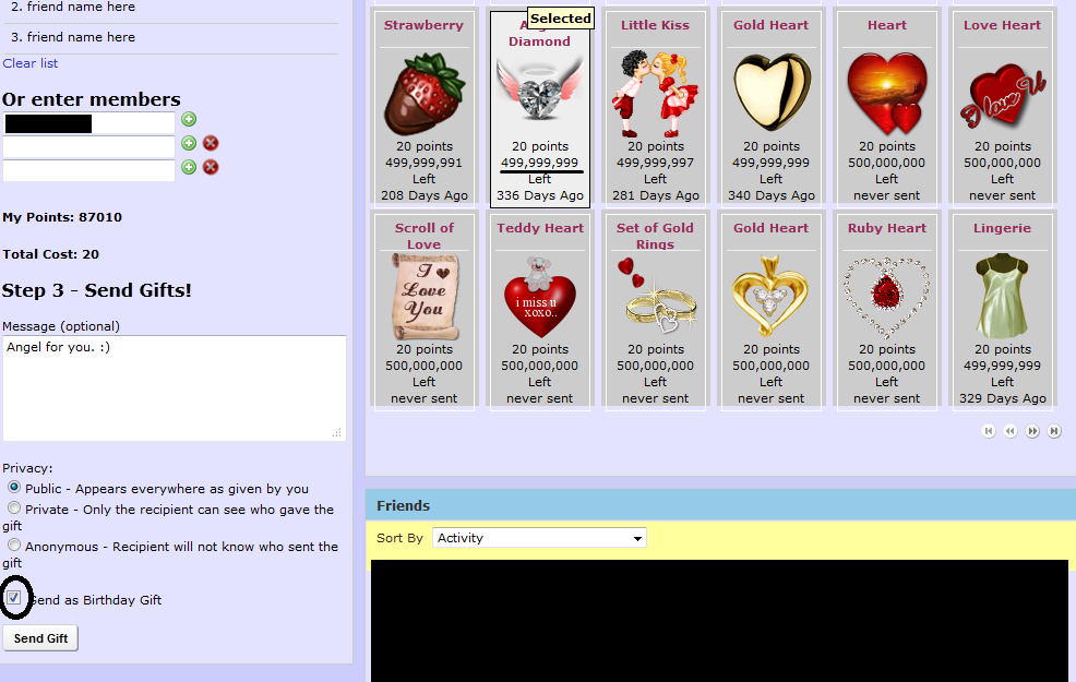 (I always thought that sending as a birthday gift is adding b-day wraps to it - but now I double checked and no such gift was ever sent - or better to say, the counter on the gifts decreases and shows the correct "days ago" info but the gift is not displayed on the my gifts sent or on the recipient) |