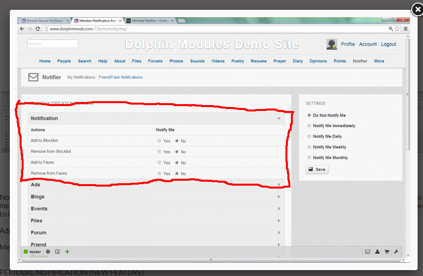 Modzzz; you stated earlier about adding an interface in the admin for the possibility that one can add third party modules to the notifier. Also, your story module is missing from the integrations. I am seeing a section missing from the member interface; is this added with a patch? The download for the module is missing the patch folder; is that possibly the problem, that I need to run the patch. See the attached image. The section outlined in red is missing. Geeks, making the world a better place |