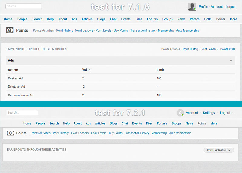 Please see attached for problem I'm having with the 11.13.15 update. When I couldn't get anything to display on the Point Activities page, I did a fresh install of Dolphin 7.21 in one test directory and another fresh install for 7.1.6 with a previous version of Ultimate Points.