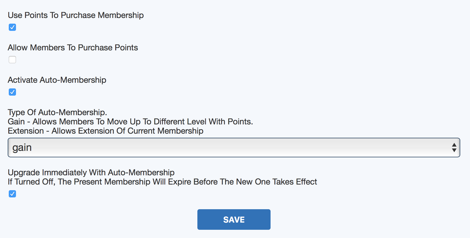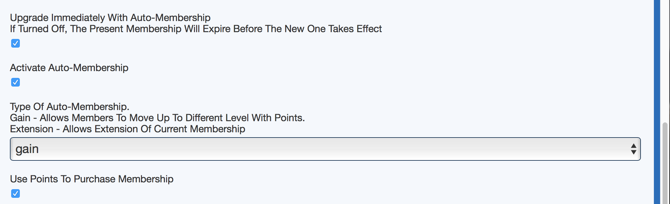 But back to the initial question/issue -- I'll double check the settings but please confirm how each of the controls on your admin page effect each other. Because the first part in the below screenshot seems to only apply to auto-upgrade. So when I had everything only set to purchase membership upgrades I had this checked off. But you explanation suggests then the old membership wouldn't expire (which means since it had no expiration the upgrade fails). Let me know if I'm missing something. So if I leave the first two check boxes unchecked and then have client upgrade through Points Membership page shouldn't it upgrade right when points are deducted?