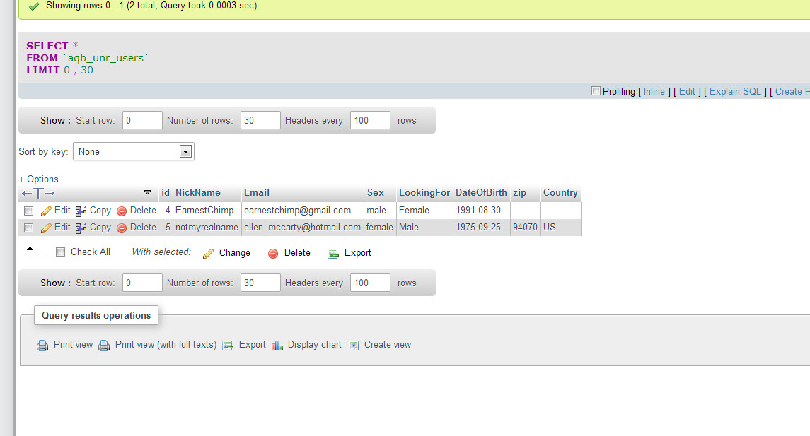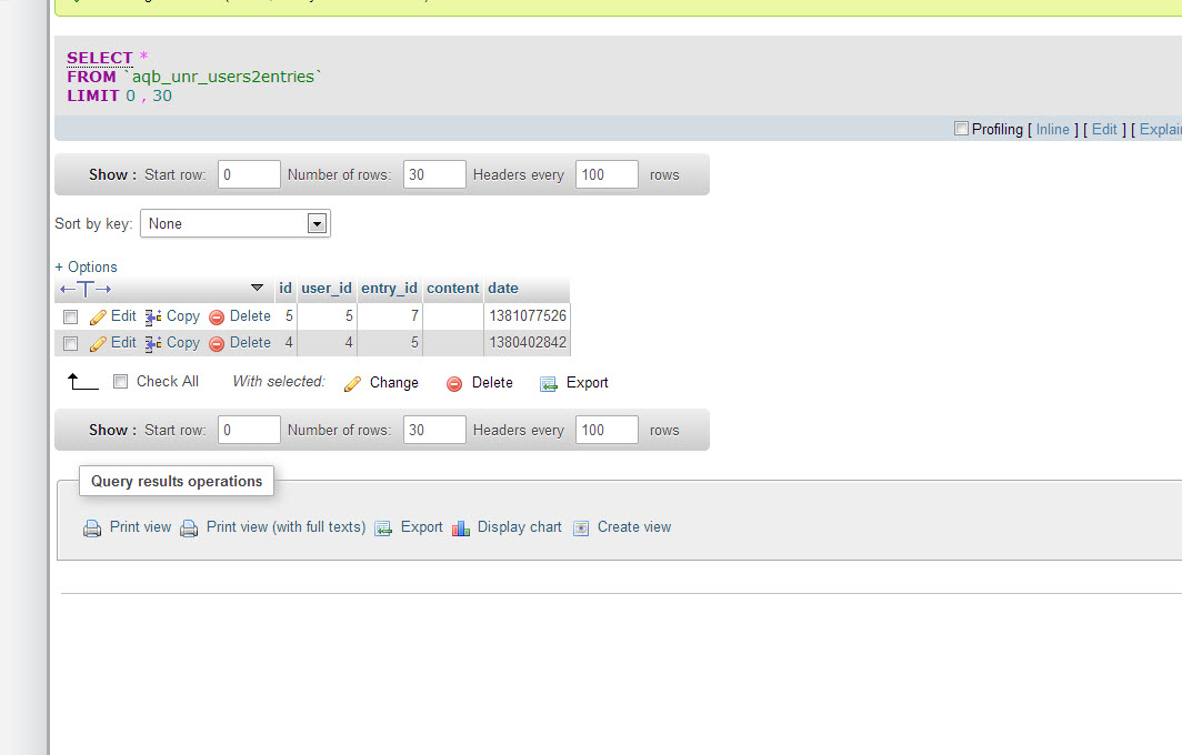 Hello Anton- Thanks for your help on this. Attached are screenshots showing only two members in the tables , yet the pie chart still shows 5. Thanks! Peer OK. Looks like I found the reason of the issue. aqb_unr_entries table has counter for each entry (unregister quiz question). These counters collect statistics and are used to print the pie. So, if you manually removed some members from aqb_unr_users and aqb_unr_users2entries tables then you need manually update that counters to have appropriate statistics. P.S. It's not so good prectice to do the changes manually in the database. It may cause a lot of issues. :) Best Regards AntonLV - http://www.boonex.com/market/posts/AntonLV |