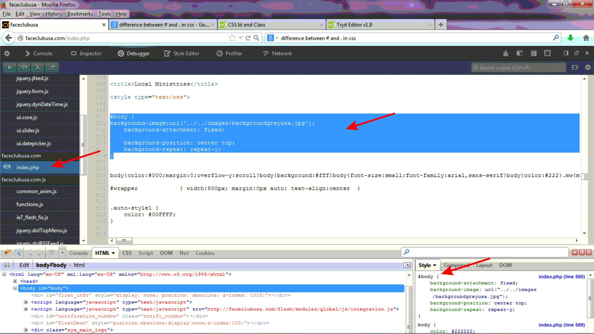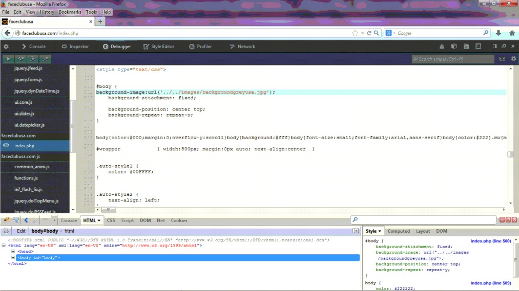 I thought I had done this wrong. OK, so is there a fix to get me back to the way it should be so I can control what I'm doing now (successfully, my site works), but in the correct way. I would like to use css to have background-image show only on homepage only. But main problem will still exist, how do I access line 500 in my homepage to delete the style I added?? Have spent hours looking for that code without luck. Thanks! PS - www.faceclubusa.com if you wanna look see | ||