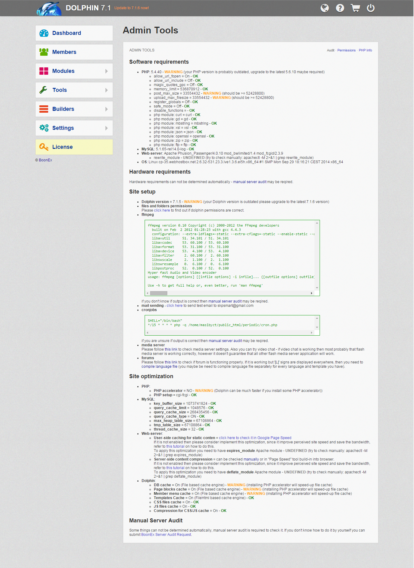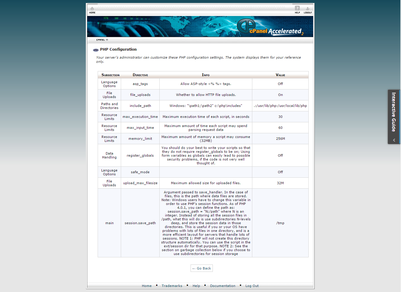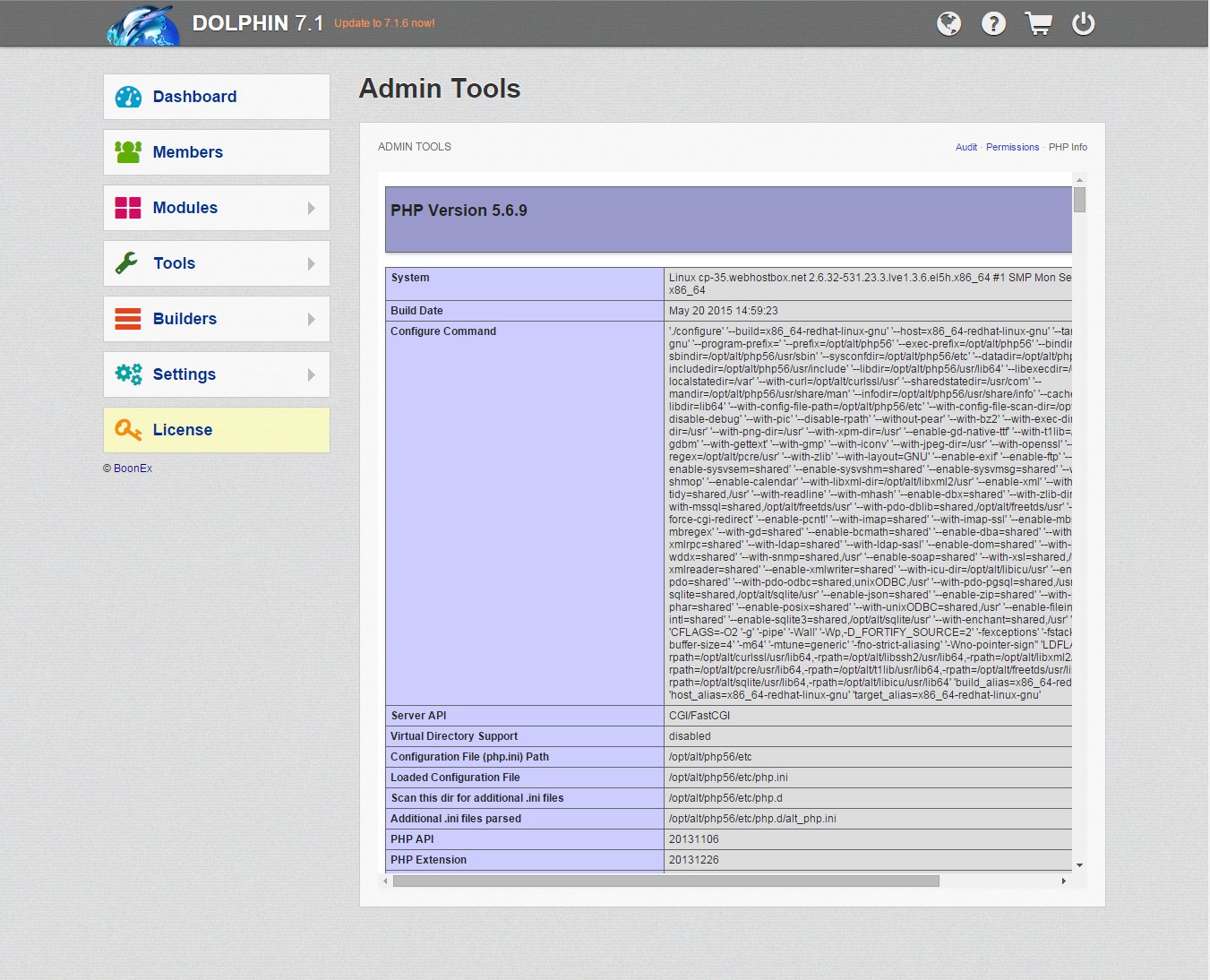 Attached are the screenshots of the php info tab of dolphin admin tools and also php configuration settings page from cpanel. I guess these will be enough for you to understand the php settings.