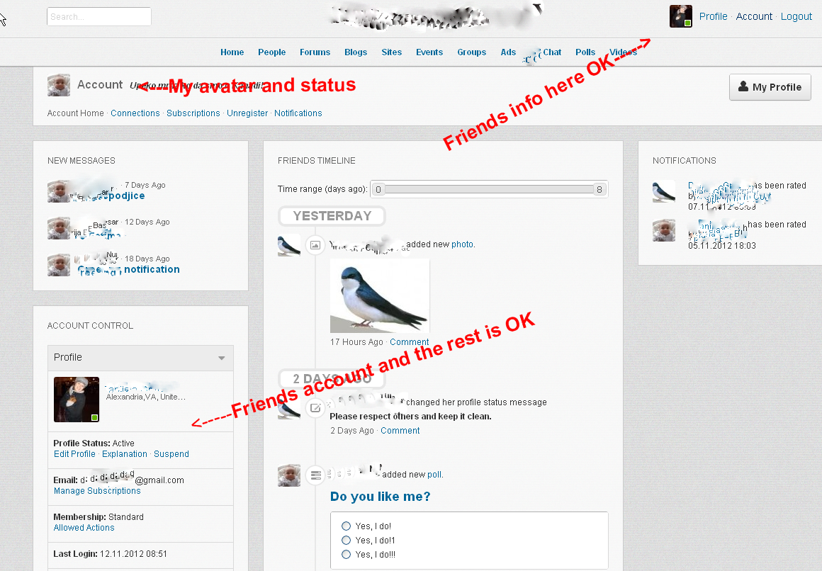 When I click on account link, in the sub main menu area... avatar and status message is someone elses, the links, such as connections, subscriptions are mine.