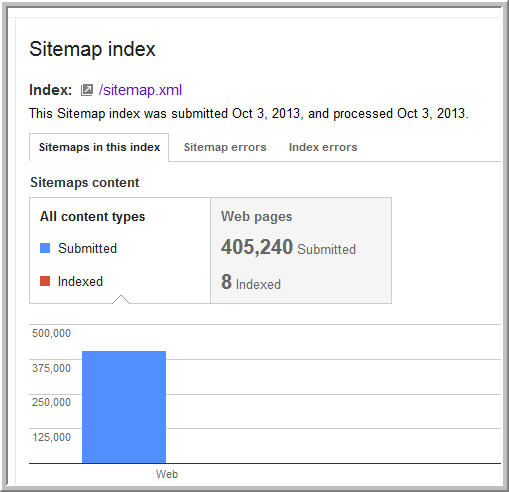 I am so thrilled I can't stand it the sitemap is designed in a way that is nothing short of brilliant! On one of my sites 40,000 properties are indexed out of 40,000. I can tell you I just submitted 405,000 pages and in an hour 16,500 of the one page submitted was indexed! THIS IS AWESOME INDEED! thank you, thank you and once again well done indeed! It took all day to get a functioning page I could submit and I do have a few issues with the page resolving but after I redirect it back to the server and not a proxy server, I am hoping that will go away as well...Being able to submit 405,000 pages in perfect format for Google priceless...