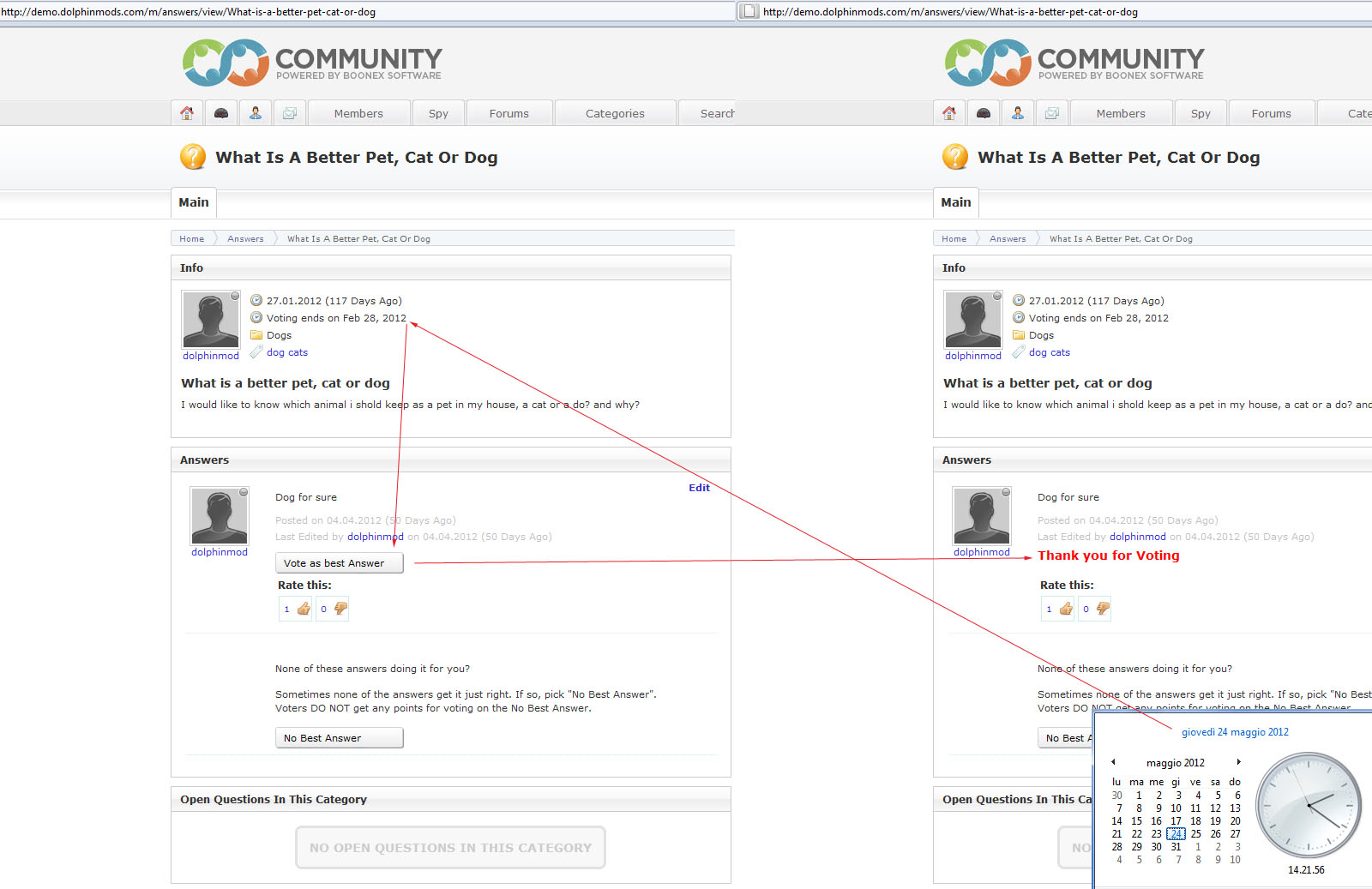 I already reported this bug by email, I suppose that you have a lot of work, and I know that you are a good developer, but I hope that this bug is be resolved at soon is possible.. The problem is that on question where he writes: Voting ends on February 28, 2012 Already we're into May 24, 2012 but it is still possible to vote, I attach an image where you can see that it still really possible to vote. Templates and Modules for Dolphin 7.3 http://www.boonex.com/market/posts/Giovanni_m |