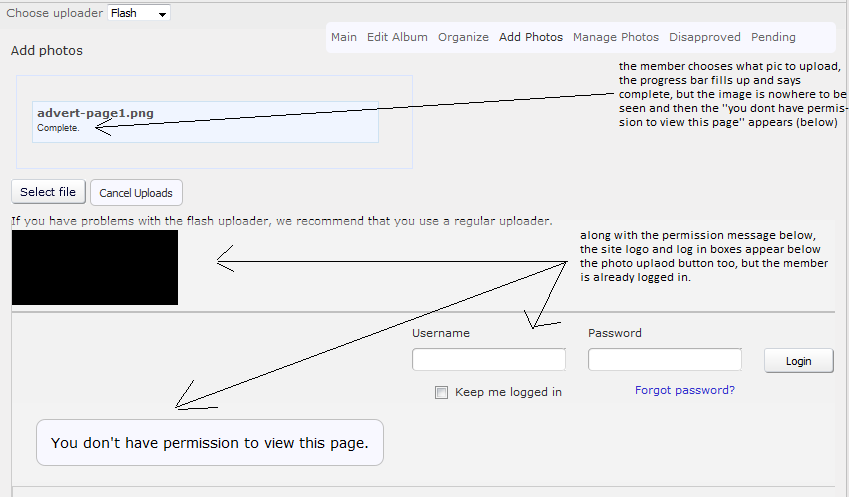 Ok just checked and seems to be working fine on internet explorer, on firefox you get the 'you dont have permission to view this page' pop up on the page after the upload bar has filled up, and on opera it doesn't even get that far, when you click on the "You have 1 photo(s) in this album. Click here to add more." once clicked it just loads the page and all it shows is the 'empty' sign.