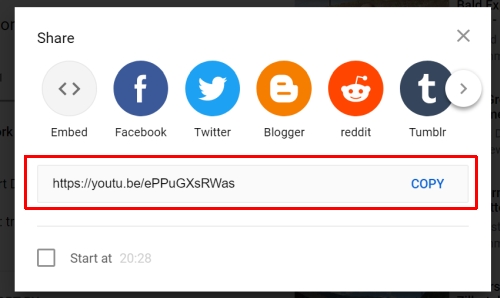 Open the YouTube Video and click the Share link on the bottom right of the video.frame.