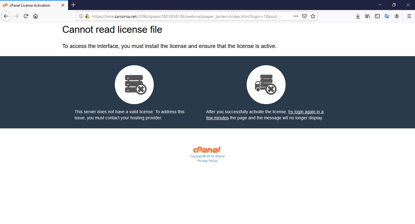 Last night, accessing Webmail through the Zarconia Client Area at least resulted in the second attached image which definitely appears to be a cPanel license issue.
