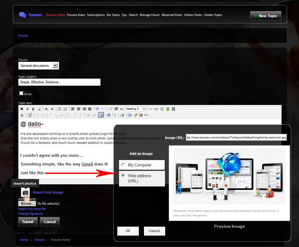 Still looking for an easy way for users to add a photo to a forum post. Not sure why there is no 'upload photo' button as standard still... most users will never get the add url method currently on offer, especially if the photo they want to add is not on a website already but on their desktop...