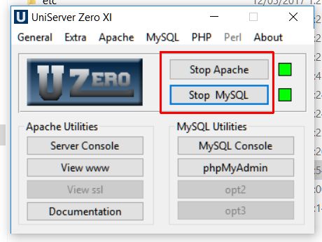 2. Start the server by clicking the Apache and MySql buttons. Both blobs should go green (image 2)