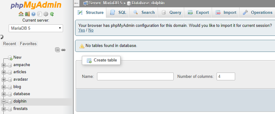 You need to check phpmyadmin again and get the full database name, not just the dolphin bit.