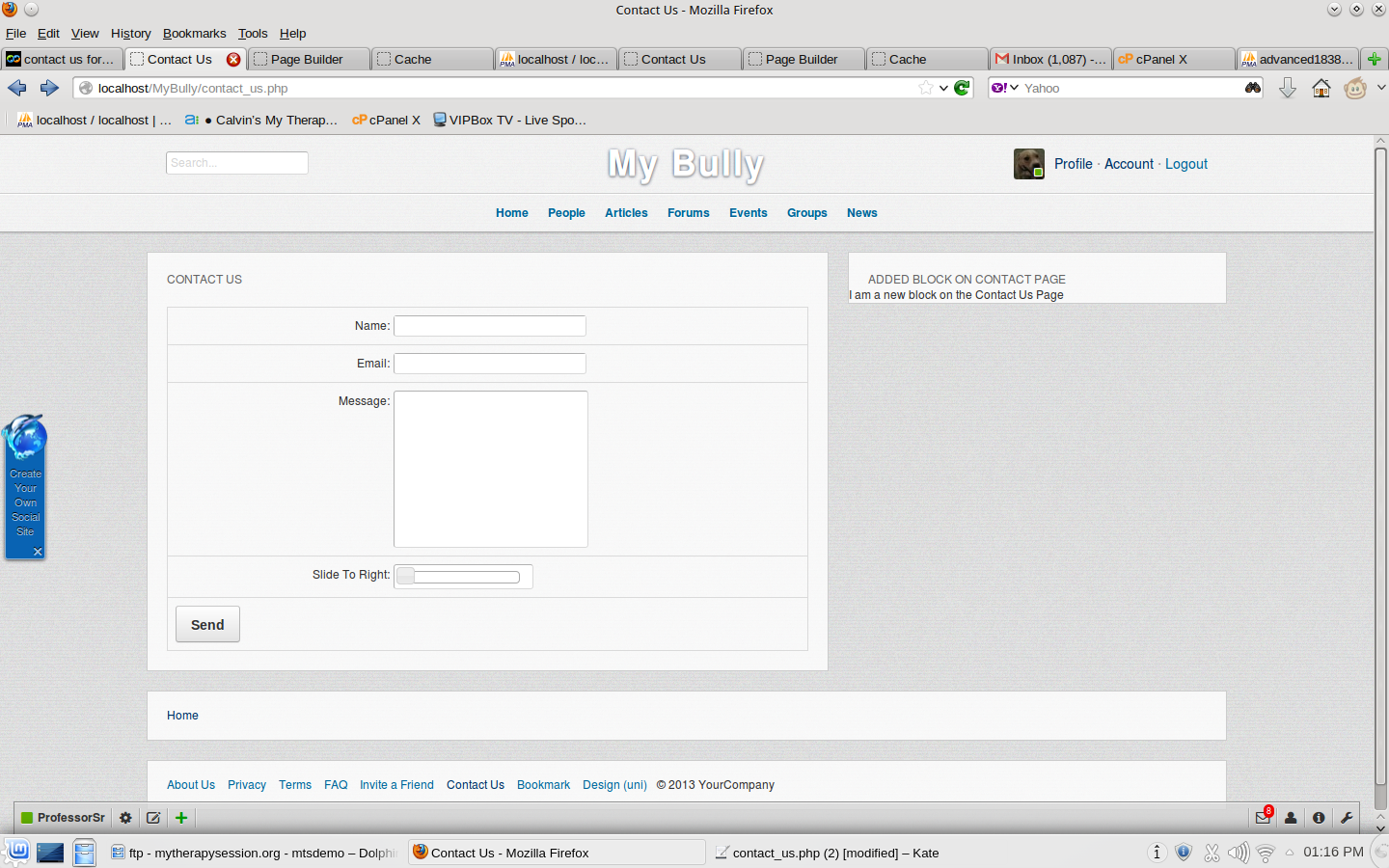 then added to database tables: INSERT INTO `sys_page_compose` (`ID`, `Page`, `PageWidth`, `Desc`, `Caption`, `Column`, `Order`, `Func`, `Content`, `DesignBox`, `ColWidth`, `Visible`, `MinWidth`, `Cache`) VALUES ('', 'contact_us', '1140px', 'Contact us Form', 'Contact Us', '0', '0', 'ContactForm', '', '1', '72.5', 'non,memb', '0', '0'); INSERT INTO `sys_page_compose` (`ID`, `Page`, `PageWidth`, `Desc`, `Caption`, `Column`, `Order`, `Func`, `Content`, `DesignBox`, `ColWidth`, `Visible`, `MinWidth`, `Cache`) VALUES ('', 'contact_us', '1140px', 'Added block on contact us form', 'Added Block on Contact page', '0', '0', 'AddedBlock', '', '1', '100', 'non,memb', '0', '0'); INSERT INTO `sys_page_compose_pages` (`Name`, `Title`, `Order`, `System`) VALUES ('contact_us', 'Contact Us', '0', '1'); ALTER TABLE `sys_messages` ADD `Email` VARCHAR(45) NOT NULL