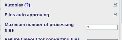 Actually "Maximum number of processing files" setting means that it will process up to 2 files per one run. Dolphin runs video processing every 5 minutes (via cron jobs). The problem maybe with big video files, if they are processing longer than 5 minutes: for example you uploaded 5 big video files and processing of one file takes approximately 15 minutes, and cron runs every 5 minutes: - after 1st cron run you will 2 files in processing and 3 files are pending processing - after 2nd cron run (after 5 minutes) you will have 4 files processing and 1 file pending processing - after 3rd cron run (after 10 minutes) you will have 5 files processing and 0 files pending - then after 15 minutes you will have 3 files processing - after 20 minutes 1 file processing - after 25 minutes all video files should be ready To limit the server load you can set to run video processing every 30 minutes (in table sys_cron_jobs) Rules → http://www.boonex.com/terms |
