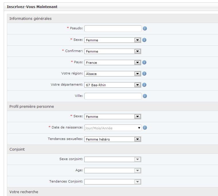 Oui, mais cela ne suffit pas. Car certaines fonctions couple ne sont pas sélectionnable. Comme ville, sexe, date de naissance. Perso, j'utilise un module: http://www.boonex.com/m/Dependent_Fields Cela permet de modifier pas mal de choses dans la page d'inscription, mais aussi et surtout d'adapter certains paramètres. Voici quelques captures d'écran de ma page d'inscription qui utilise ce module: