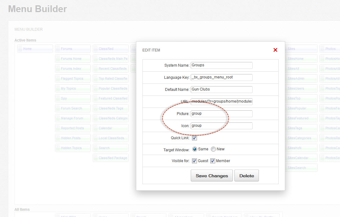 To use images instead of text icons: It's done the same way. Admin >> Builders >> Navigation Menu >> Click on block's name you want to change ie. "Groups" and change the picture/icon name to the filename of the adult icon, then upload image to /templates/base/images/icons